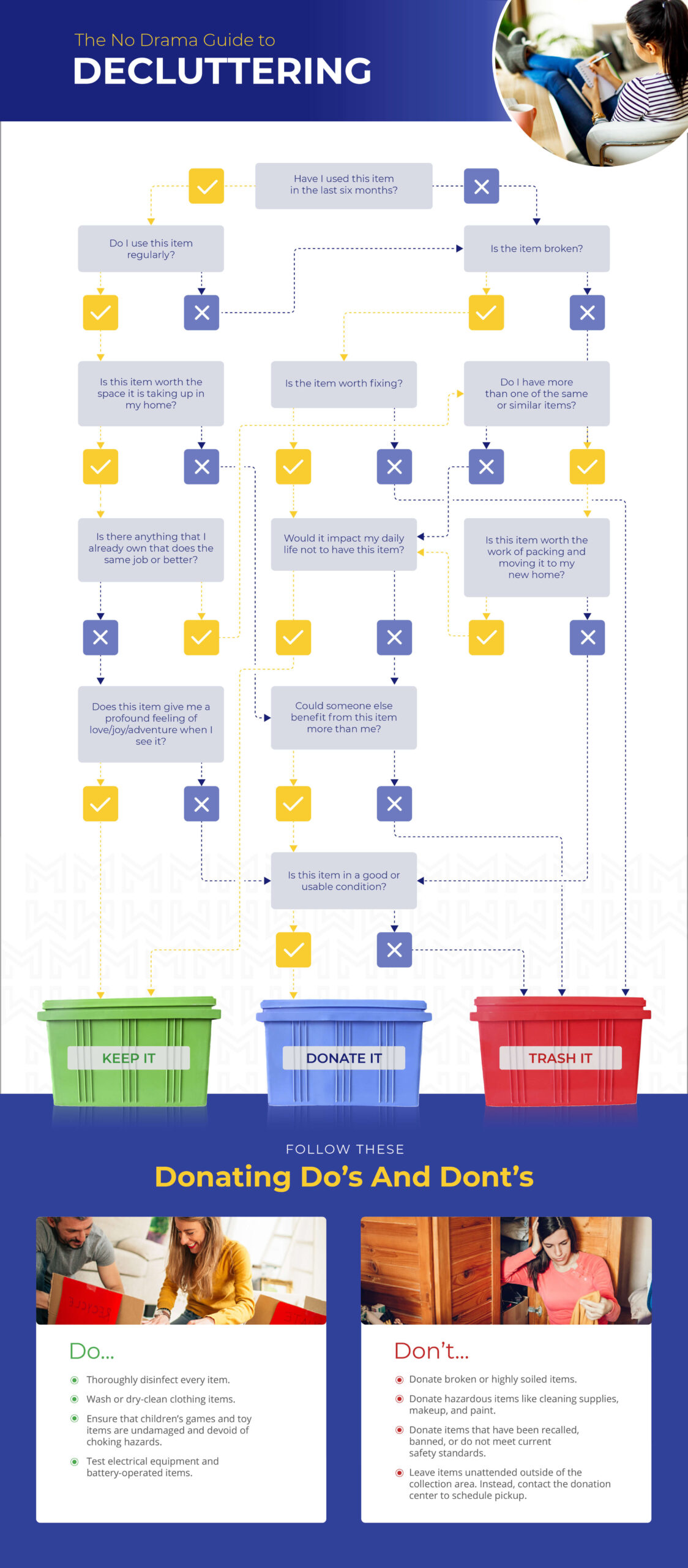 Do you need help decluttering? Use our donation decision tree to decide if an item is worth bringing to your new home, dropping off at the charities above, or simply throwing away.