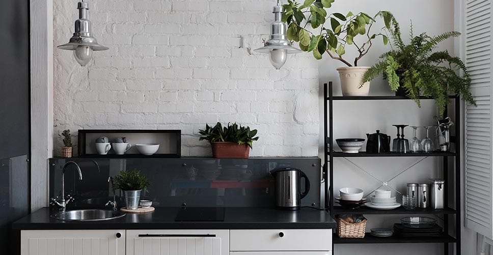 Interior of minimalist kitchen with subway tile backsplash