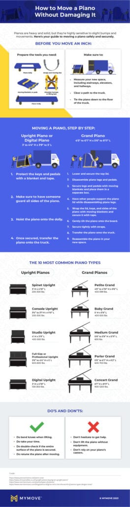 Those weights are pretty daunting, so you’ll need to recruit a lot of help. Even the smallest of upright pianos will take at least three adults to get it safely from one place to another. Remember this: The consequences of dropping a piano are severe.