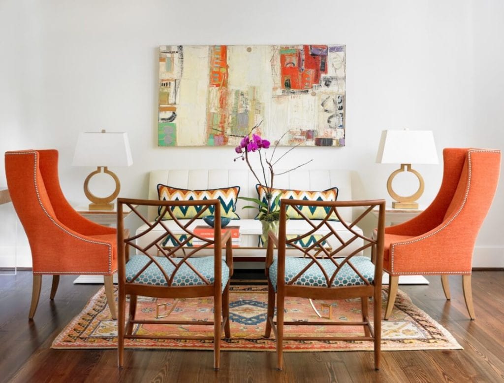 One major benefit of wall art is that it’s easy to swap out as your whims change. If you’d like a new color scheme in a space, start by changing or adding in wall art that incorporates the new color. An example is the wall art in the photo above, which has orange tones that reflect the chairs and tones in the throw pillows.