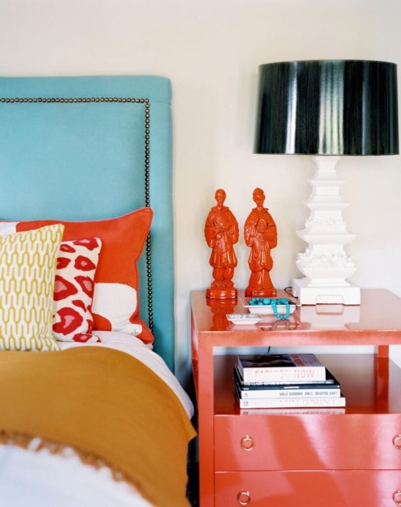 Another idea for an updated color scheme is to simply paint some accent furniture or buy small pieces that have the new color you wish to introduce. An example is the orange nightstand in the photo above. Furniture pieces like this are easy to find new, used or you can paint them yourself. You could get colorful wooden chairs, coffee tables or end tables, as a few other ideas. They’re a low-fuss way to get a new color in the room without having to do any major paint jobs or large-scale furniture replacements.