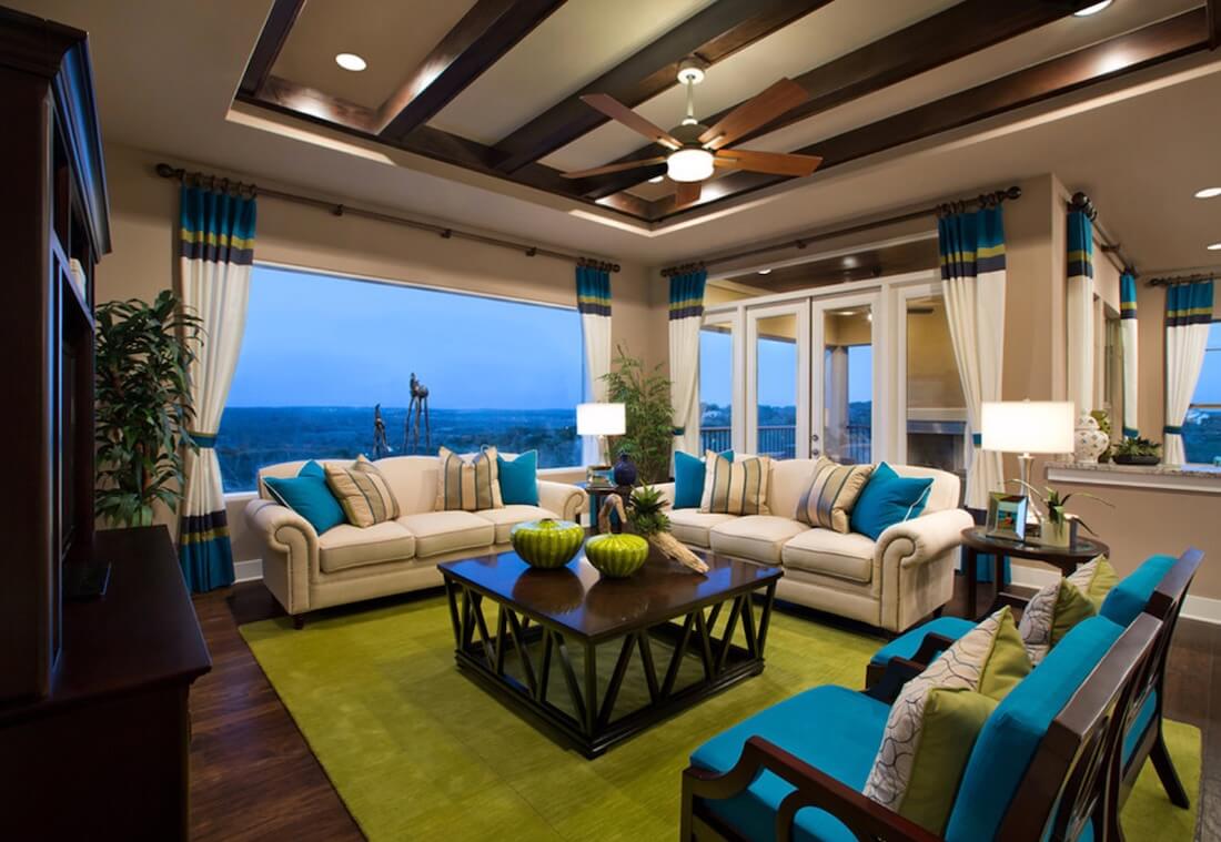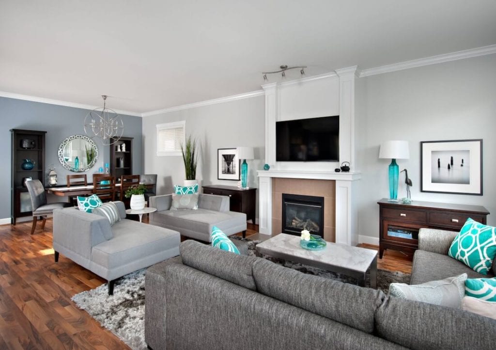 You can get an updated color scheme in any space by wisely choosing what elements you have on the tables and shelves. The photo above shows how some bright aqua works into the neutral space above simply by placing the lamps, a bowl on the coffee table and some bright candles back by the mirror.